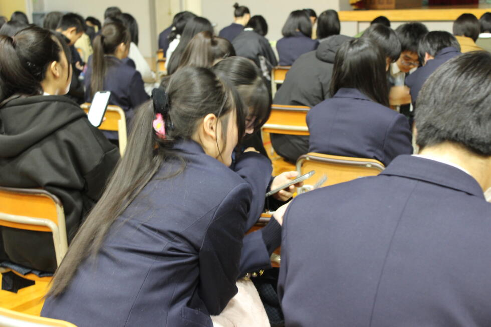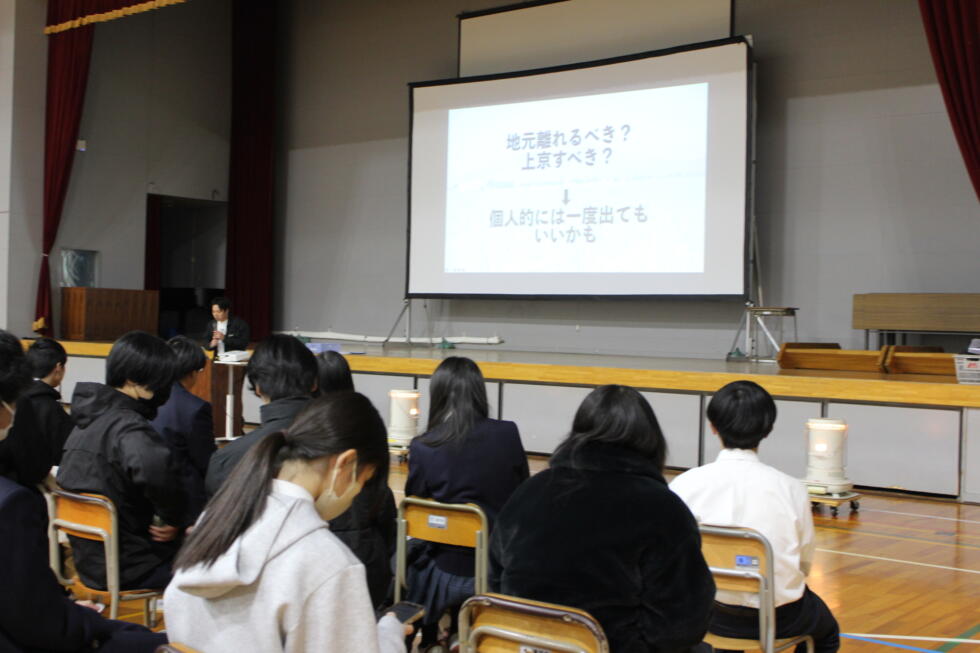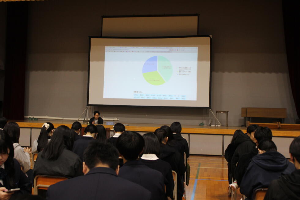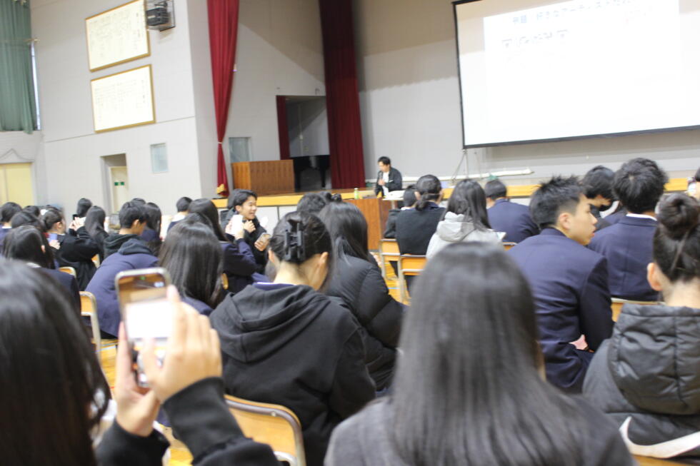 11月19日(水)5・6校時、1年次生のキャリア学習の一環として、シャドウ國本氏をお招きして、「やまがたのスペシャリストに聞くトップセミナー」を行いました。双方向講演として、國本氏の問いかけに生徒はスマートフォンを利用し答える形式で、和気あいあいと熱のこもったお話をいただきました。将来を考える良いきっかけとなったことと思います。熱い講話をいただきありがとうございました。