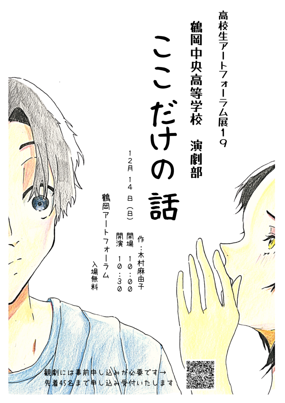 下記の日程で、高校生アートフォーラム展19演劇専門部発表 「ここだけの話」を上演します。この作品は令和7年度の県合同発表会で最優秀賞に選ばれ、12月の東北大会(宮城県)で上演する作品となっています。全国大会出場を目指して、部員一同、日々の練習に励んでおります。皆様のご来場を心よりお待ちしております。